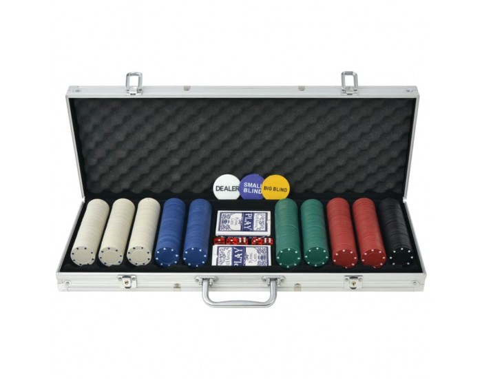 Този комплект включва 5 казино зарчета, 2 тестета карти, 1 малък блинд бутон, 1 голям блинд бутон, 1 дилърски бутон и 500 чипа. Този комплект се доставя в алуминиева кутия.