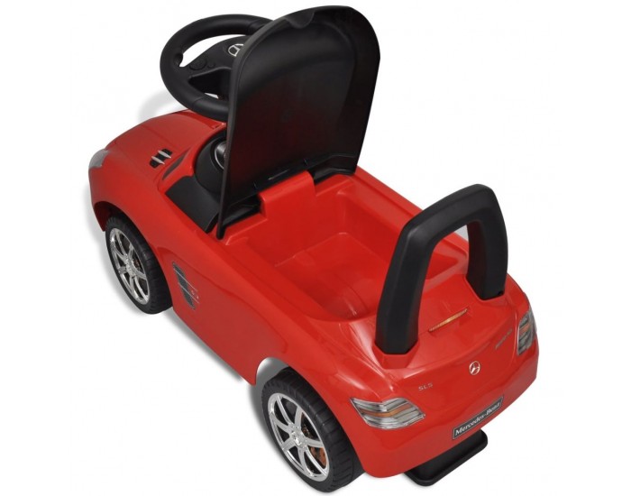 Тази детска кола за яздене в стил Mercedes Benz е една реалистична и безопасна детска играчка. Има шест песнички, които се активират от бутоните на волана. Мястото за съхранение под седалката е подходящо за поставяне на малки играчки. С устойчива пластмасова конструкция, детската кола е с максимална товароносимост от 23 кг и е предназначена за деца от 2+ години. Стабилната основа с 4 колела позволява лесното качване и слизане на детето от колата. "Mercedes-Benz" и дизайнът на продукта са обект на интелектуална собственост на Daimler AG. Моля, отбележете, че двете батерии тип АА, необходими за звука, не са включени в доставката.