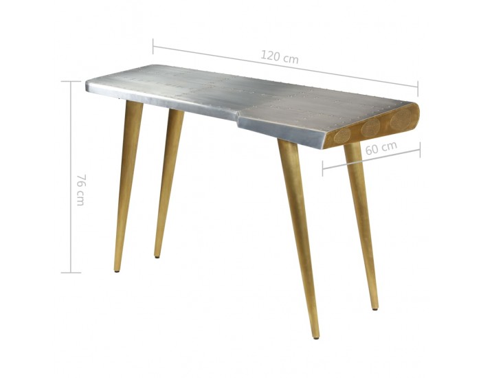 Бюрото в стил самолет е изработено от масивна дървесина от манго, а повърхността му е облицована с различни по размер полирани алуминиеви панели с акценти от видими стоманени винтове, което го прави изключително издръжливо. Стоманените крака в цвят месинг и оформлението на винтовете придават индустриален вид на масата в авио стил. Тя има голям плот, който предоставя достатъчно място за поставяне на вашите папки, документи, книги или други вещи.
