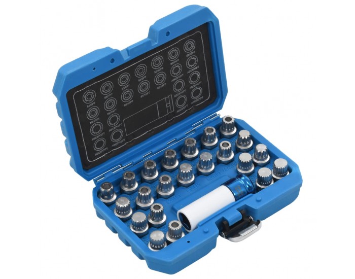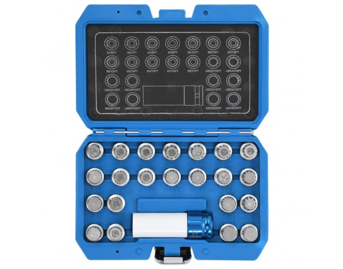 Този комплект за развиване на секретни болтове от 23 части съдържа 22 вложки за развиване с различни размери и 1 защитна ударна вложка. Той е предназначен за сваляне или за поставяне на секретни болтове на джантите на повечето автомобили VAG.