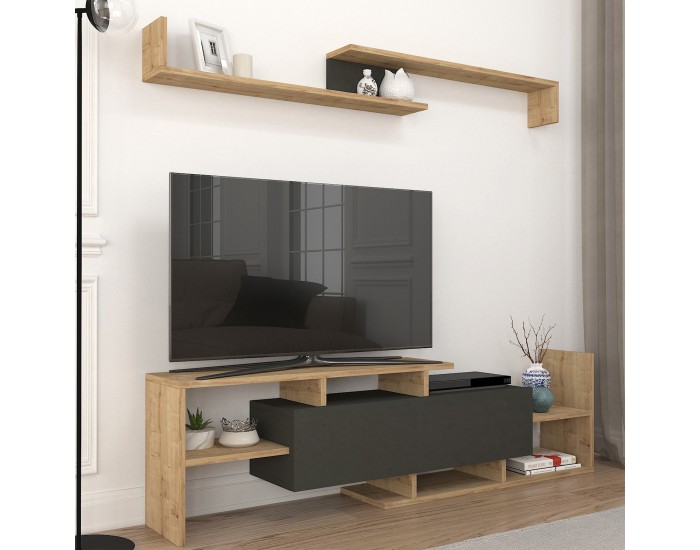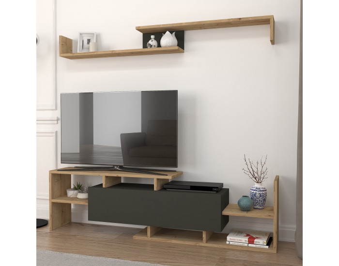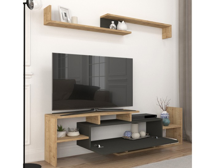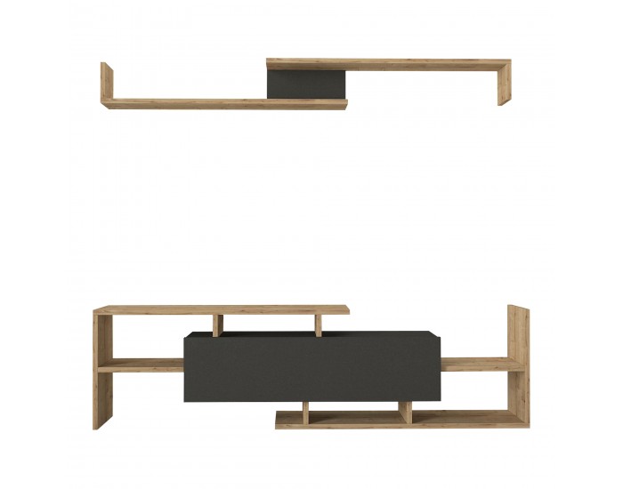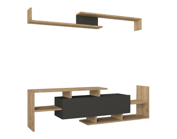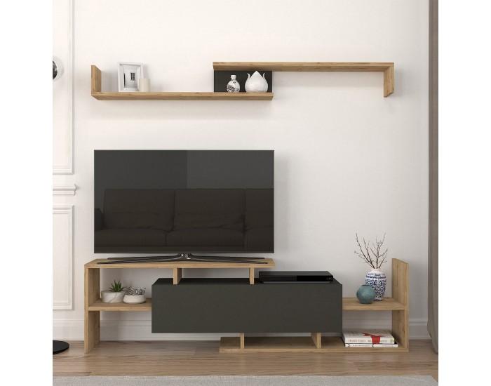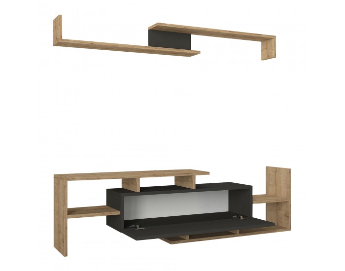 Голямото пространство за съхранение на ниската дъска предлага достатъчно място за вашия телевизор. Под него има множество отворени отделения и рафтове, идеални за съхранение на медийни устройства като DVD плейъри или игрови конзоли. Подходящият рафт за стена допълва шкафа за телевизор и идеално завършва комплекта. Той е идеален за показване на снимки, декорации, растения и други лични съкровища.