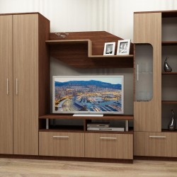 Секция MiamiMiami представлява практична секция, състояща се от ТВ шкаф с чекмедже, ниша и две вратички; двукрилен гардероб; етажерка с две вратички и ниши; висок шкаф с две вратички, едната от които е с витрина; рафтчета.Моделът се изработва от ПДЧ, в цветовете: Дъб суров + графит.Не се изисква мон..