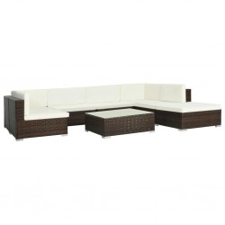 Този полиратанов комплект мека мебел, състоящ се от 1 модул ъглов диван, 3 модула централен диван, 1 маса за кафе, 3 табуретки, 5 възглавници за облягане и 7 възглавници на седалките, предлага стилен кът с мека мебел за вашата градина или двор. Благодарение на водоустойчивия PE ратан, комплектът мек..