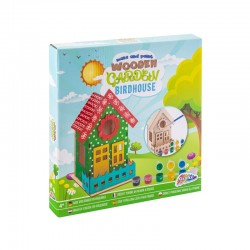 Арт комплект, съдържащ дървена къщичка за птици, предназначена за оцветяване, 6 разноцветни боички и четка за рисуване.