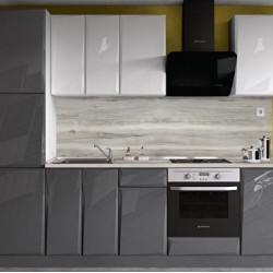 Кухня K 2-dst, антрацид и бял дъбКухнята K 2-dst е идеална за жилища с малки размери.Долният ред е се състои от модулен шкаф за мивка, с две чекмеджета и врата, термоплот Мрамор бял с дебелина 28 mm. До него е шкаф за печка тип „Раховец”. Горният ред се състои от шкаф с рафт, стъклена витрина и шкаф..