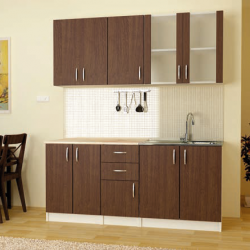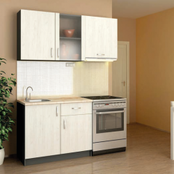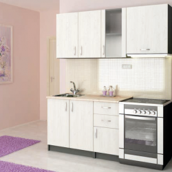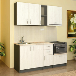 Кухня Alina 200-E20, елшаКомплект горни и долни кухненски шкафове от ламинирани плоскости. Цената включва шкафове и термо плотове. Шкафът за мивка е без термо-устойчив плот. Възможност за разместване на шкафовете.Размери: дължина - 200 см; Горен ред: 200/30.5/57.5 см; Долен ред: 200/60/85 ..