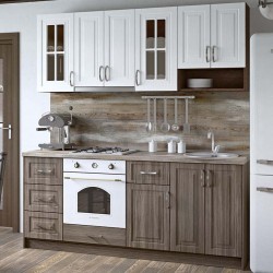 Кухня Imperia 240-E20Готов комплект за кухня "mperia", без термоплот. Включва множество горни и долни кухненски шкафове, включително витринен шкаф, шкаф за мивка и две етажерки. За изработката им са използвани висококачествени материали МДФ и ПДЧ, гарантиращи здравина и стабилност.В посочената цена ..